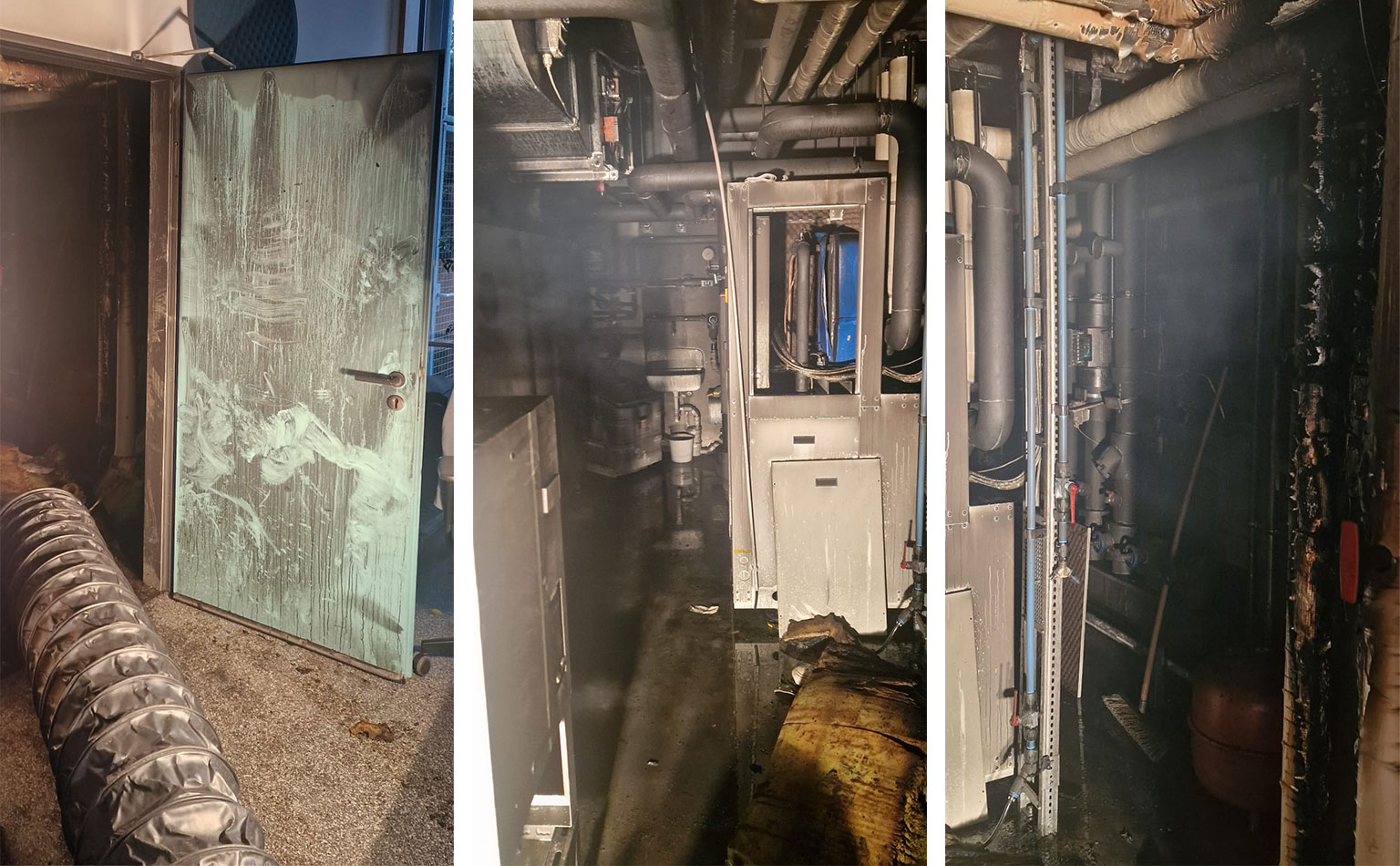 Im Heizungsraum im Erdgeschoss brach ein Feuer aus. Durch die starke Rauchverteilung gelangten Rauch und Schadstoffe über die Lüftungsanlage in alle Bereiche des Gebäudes. Das Gebäude wurde vollständig evakuiert und blieb auch nach den Löscharbeiten nicht nutzbar.